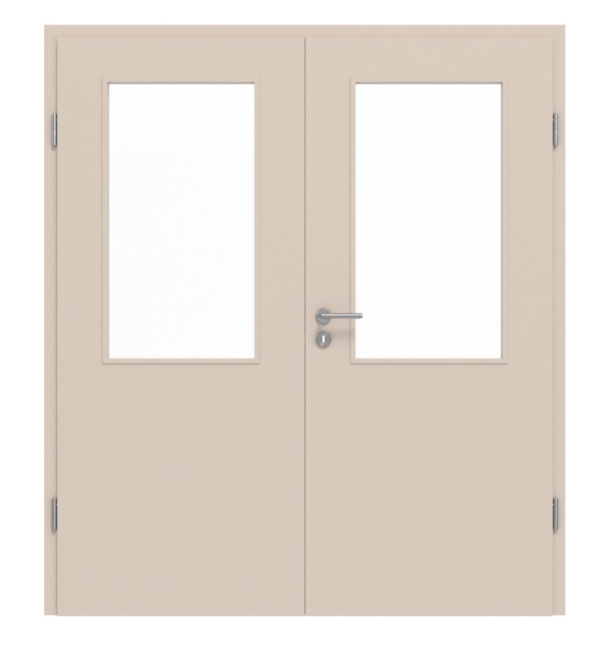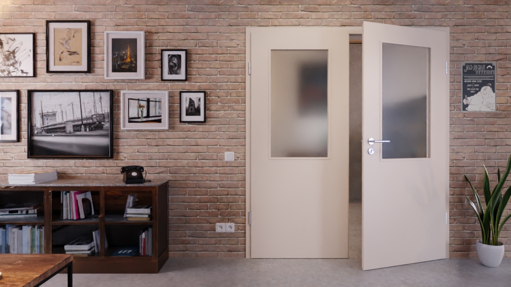 Drzwi są utrzymane w kolorze beżowym i rozjaśnione dwoma większymi przeszkleniami na wysokości oczu. W przypadku szkła można wybierać między materiałem przezroczystym a szkłem satynowanym.