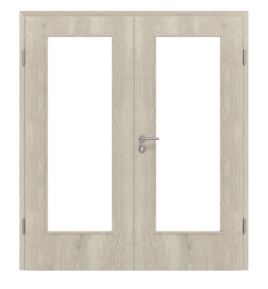 Niedrogie drzwi wewnętrzne dwuskrzydłowe: Drzwi dwuskrzydłowe 4.3 z powierzchnią CPL w kolorze dębu Kendal wraz z ościeżnicą firmy Classen idealnie dopasują się do wystroju Twojego salonu.