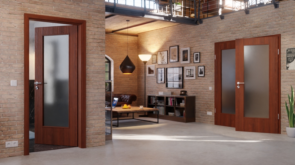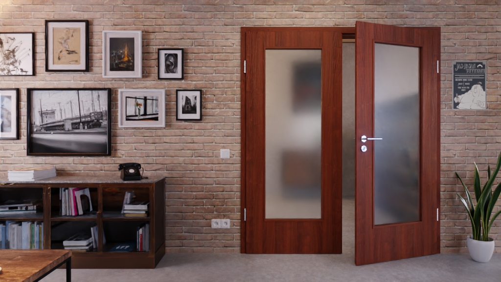 Na ciemnym podłożu widoczne są drobne cieniowania, które nadają podwójnemu skrzydłu drzwiowemu naturalny charakter. Połączenie przeszklenia i jasnego wykończenia w kolorze orzecha włoskiego tworzy autentyczny wygląd.