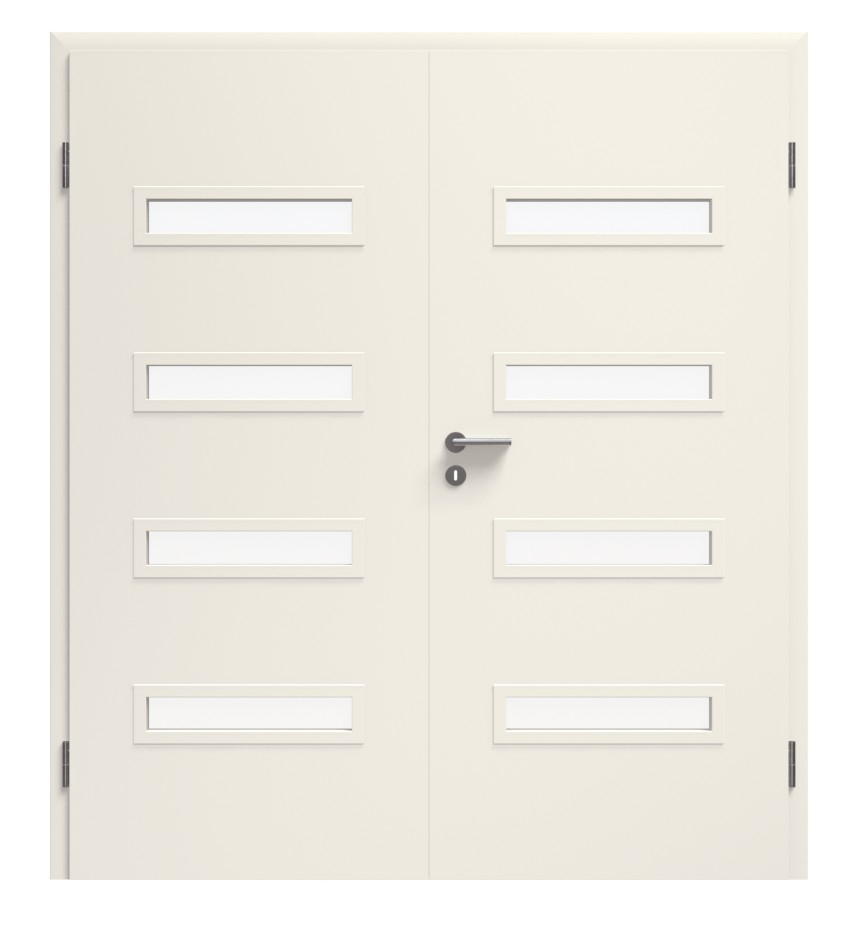 Nieinwazyjny design oferuje wiele możliwości aranżacyjnych w Twojej nieruchomości. Model z czterema wąskimi przeszkleniami na każdym skrzydle drzwi wygląda nowocześnie i na czasie. Poziome świetliki akcentują, nie przytłaczając. Opcjonalnie listwy szklane mogą być wykonane w wersji na równi z powierzchnią. Dostępna jest szeroka gama rodzajów szkła. Wielowarstwowa struktura lakieru w RAL 9010 obiecuje jakość, którą można zobaczyć i poczuć.