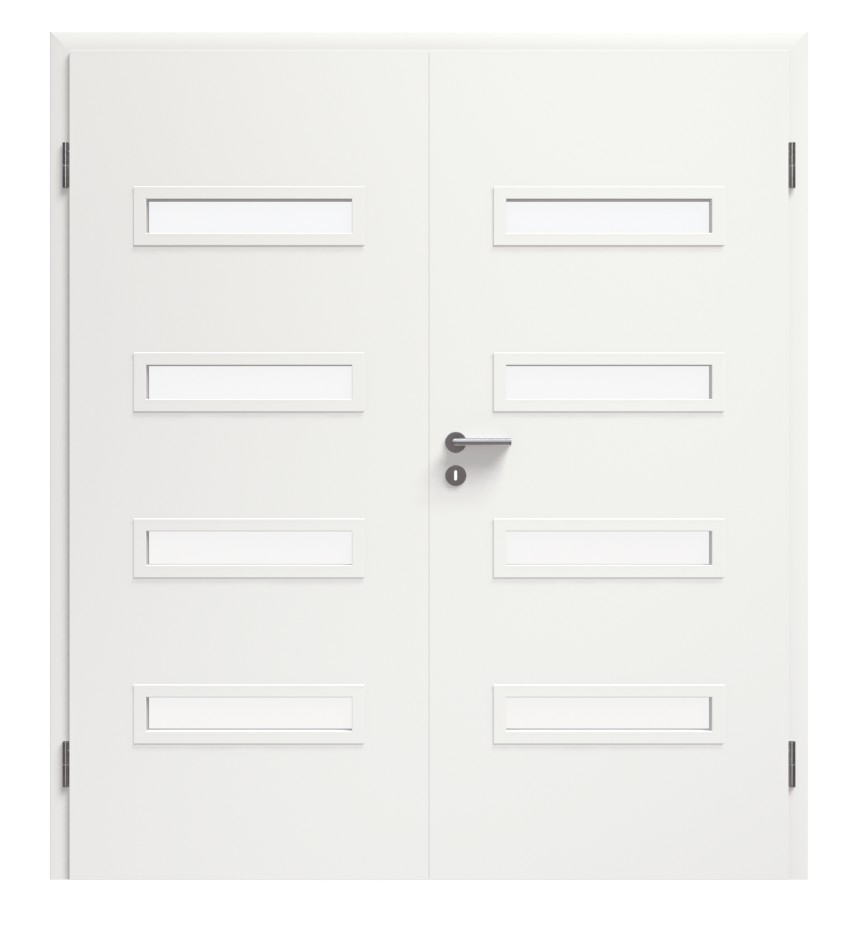 Nieinwazyjna i elegancka, wysokiej jakości powierzchnia lakieru białego w RAL 9016. Nałożona w wielowarstwowym procesie lakierowania, tworzy jednorodną, jedwabistą powierzchnię. Model z czterema wąskimi przeszkleniami na każdym skrzydle drzwi wygląda nowocześnie i na czasie. Poziome świetliki akcentują, nie przytłaczając. Opcjonalnie listwy szklane mogą być wykonane w wersji na równi z powierzchnią. Dostępna jest szeroka gama rodzajów szkła.