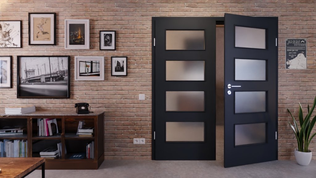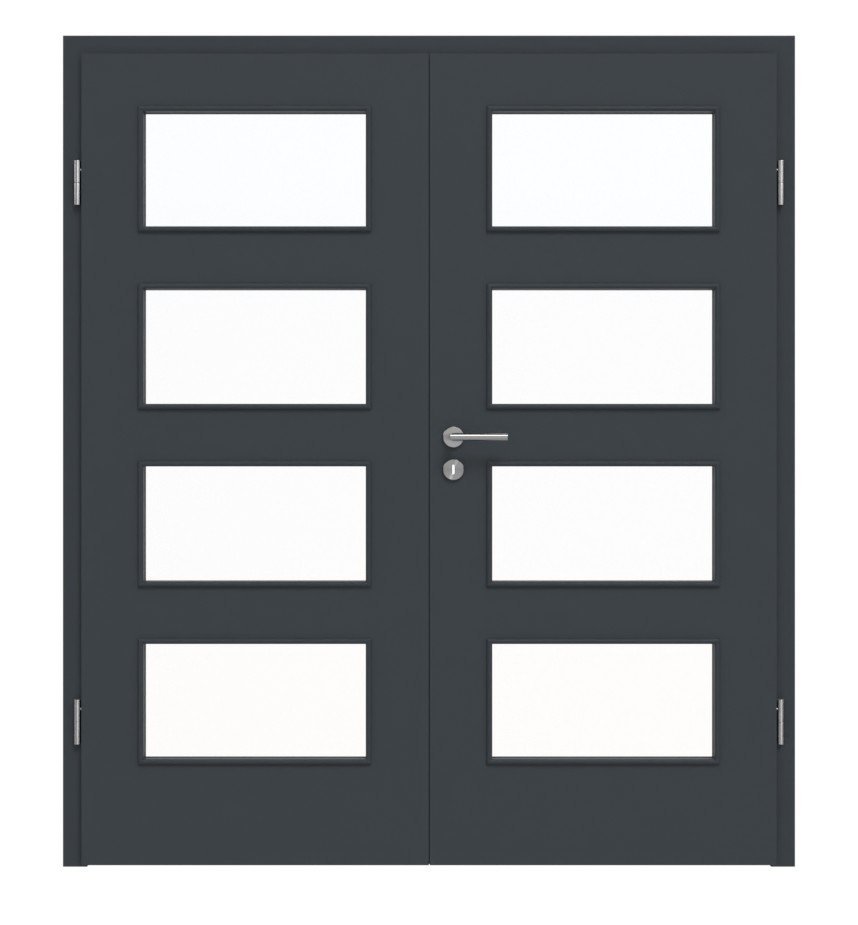 Połączenie przeszklenia i satynowej powierzchni w stylowym kolorze antracytowym zapewni elegancki wystrój wnętrza. Osiem prostokątnych wycięć na szybę zapewnia dużo światła i przytulności w Twoim domu.