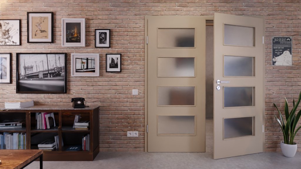 W szarobrązowych skrzydłach drzwiowych umieszczono po cztery wycięcia na szybę . Zapewniają one otwartąatmosferę przestrzeni mieszkalnej. Jedwabiście matowa powierzchnia zachwyca przyjemnąw dotyku fakturą.