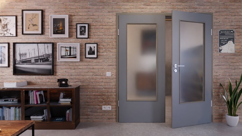 Dzięki dużym wycięciom na szyby pośrodku obu skrzydeł drzwiowych do pomieszczeń wpada dużo więcej światła. Design zapewnia otwartą aranżację przestrzeni mieszkalnej. Szara powierzchnia wygląda elegancko dzięki satynowemu połyskowi.