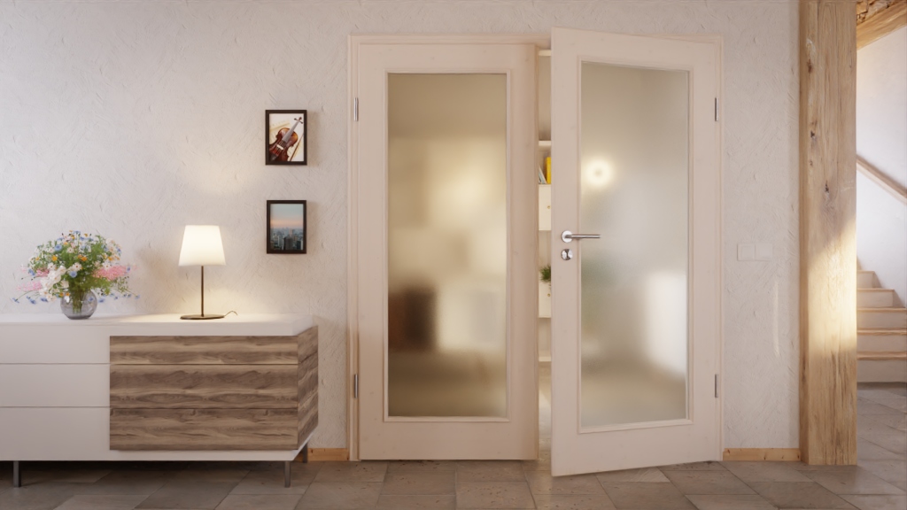 Duże szkła wpuszczają dużo światła i przyjemnie rozjaśniają pokój. Otwory otoczone są pięknie ozdobnymi listwami szklanymi i szerokimi fryzami. Dzięki białemu pigmentowanemu wykończeniu delikatnie przebija sękata struktura sosny.