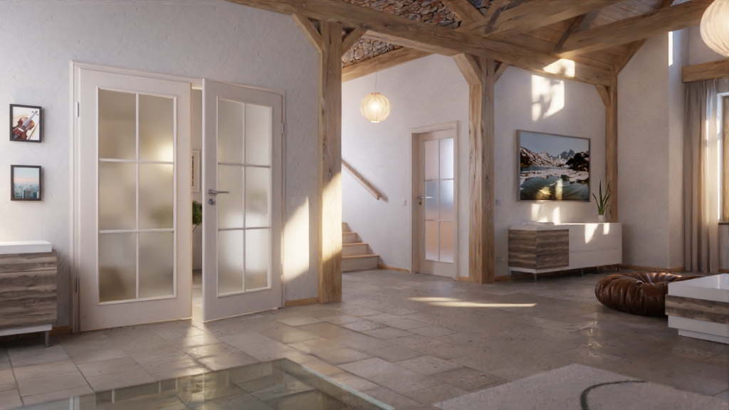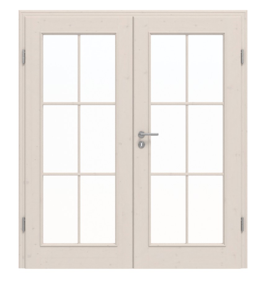 Dzięki dużym przeszkleniom skrzydła drzwi wprowadzają światło do pomieszczenia. Otwory zdobią stylowe szprosy i elegancko zdobione listwy. Z wdziękiem uwidacznia się sękata struktura świerku pod białą pigmentacją, nadając każdemu drzwiom indywidualny charakter.