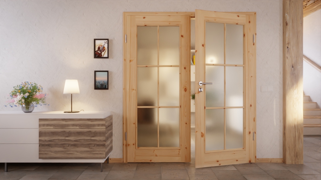 Dzięki dużym przeszkleniom skrzydła drzwi wprowadzają światło do pomieszczenia. Otwory zdobią stylowe szprosy i elegancko zdobione listwy. W drewno sosnowym wyraźnie rysują się charakterystyczne ramy sęków, nadając mu rustykalny charakter.