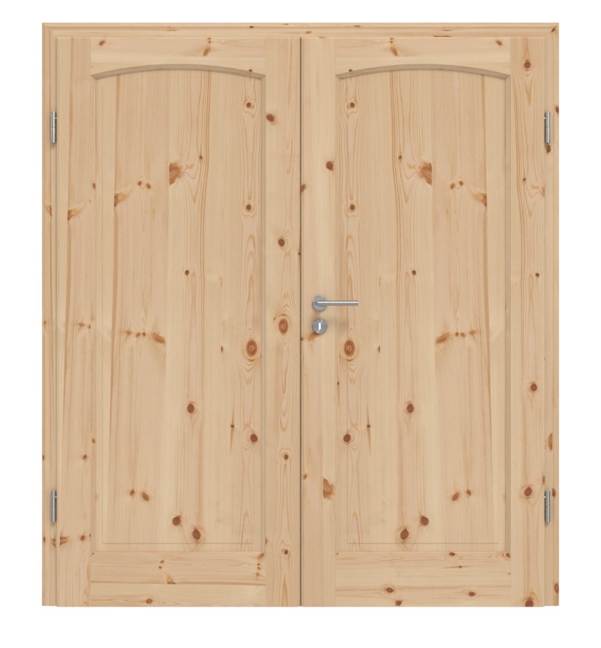 Osadzone w eleganckich profilowanych fryzach, dwa wyodrębnione wypełnienia z łukiem segmentowym stanowią wspaniały element przyciągający wzrok. Urokliwy charakter drewna sosnowego żyje dzięki wyrazistym przejrzystościom sęków i typowym usłojeniom.