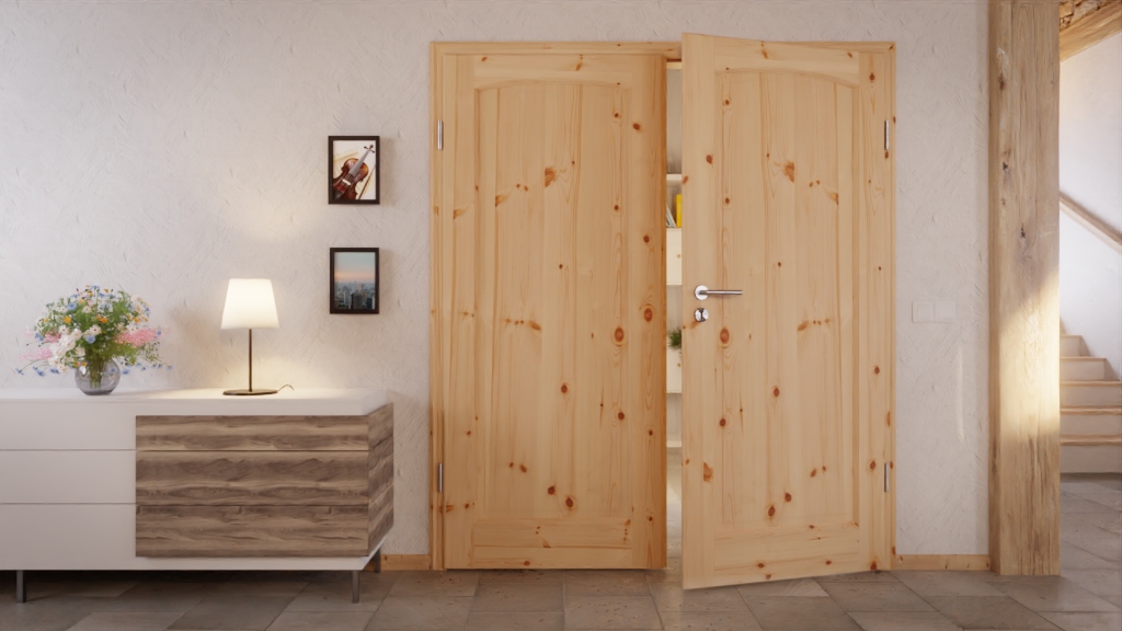 Stylowy i indywidualny: Gustowna drzwi podwójne z litego drewna TE-18 w sosnie sękatej oferuje ponadczasowy design w najlepszej jakości wykonania.
