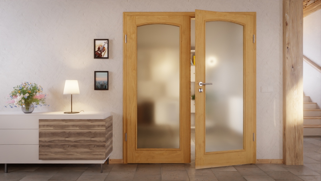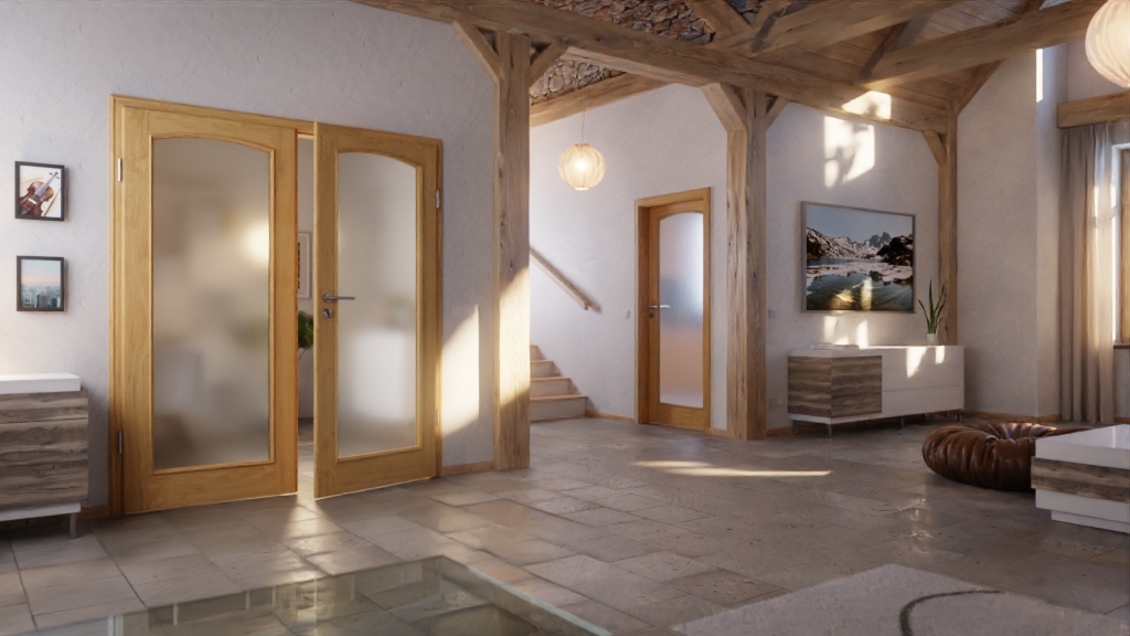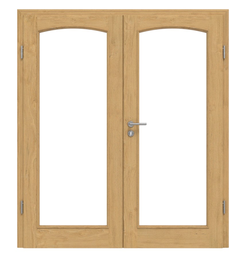 Dzięki dużym otworom świetlnym z eleganckimi łukami segmentowymi do pomieszczenia wpada przyjazne światło. Ozdobne listwy szklane i szerokie fryzy dopełniają klasyczny design. Na każdej drzwiach rozwijają się słojenia dębu w ich naturalnej indywidualności.