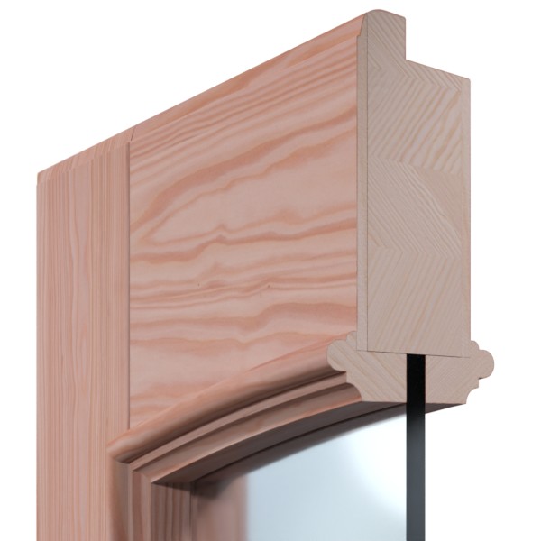 Szerokie fryzy i elegancko zdobione listwy szklane otaczają duże przeszklenia, które na górze kończą się stylowym łukiem segmentowym. Naturalne usłojenie zdobi drewno modrzewiowe, które w swojej ciepłej estetyce tworzy przytulną atmosferę.