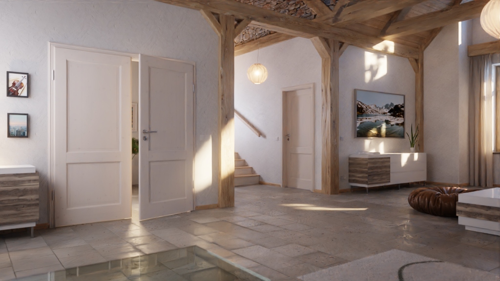 Każde skrzydło drzwiowe otoczone jest ozdobnymi wypełnieniami, co tworzy elegancki wygląd z wyraźnymi konturami. Z wdziękiem rysuje się sękata struktura sosny pod białą pigmentacją, nadając każdemu drzwiom indywidualny charakter.