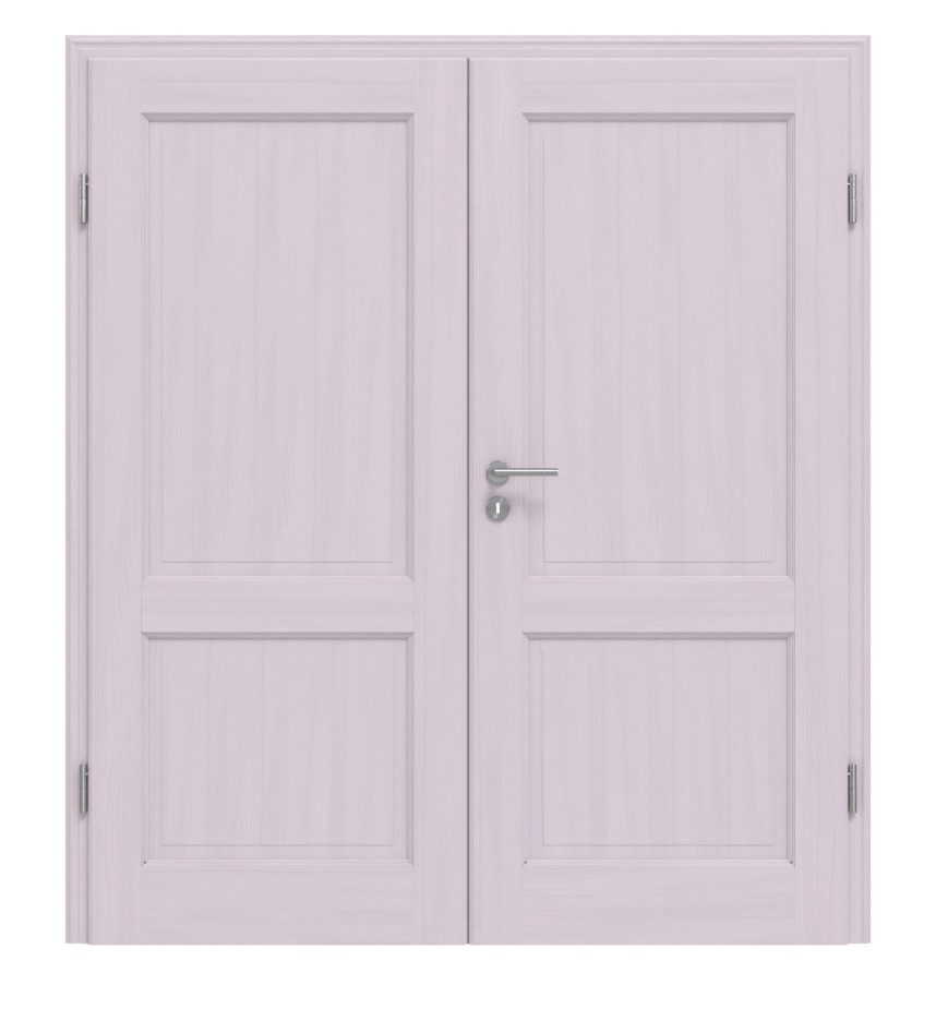 Każde skrzydło drzwi otoczone jest profilowanymi wypełnieniami i ozdobnymi fryzami, co tworzy elegancki wygląd z wyraźnymi konturami. Delikatnie przez białą pigmentację przebija się bezsękowy rysunek sosny.
