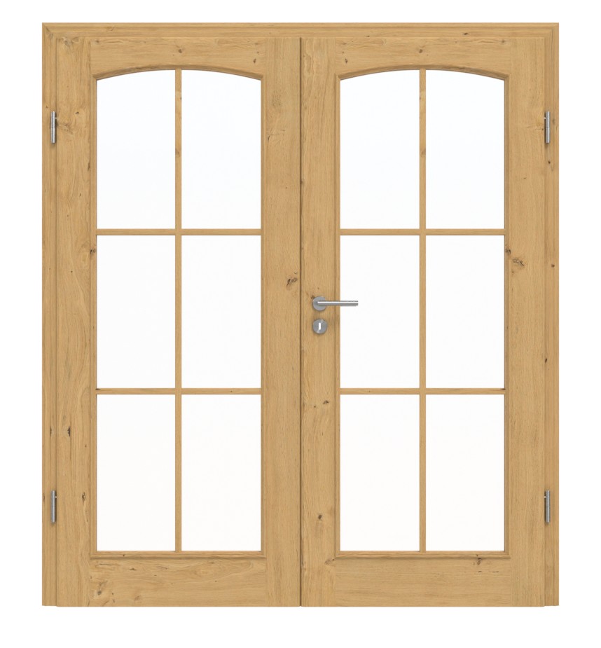 Dwie przestronne szklane otwory z podziałami i łukiem segmentowym wpuszczają dużo światła do Twoich pomieszczeń. Szerokie listwy są harmonijnie uzupełnione przez ozdobne ramki szklane. Charakterystyczne słoje z udziałem sęków przebiegają przez rustykalne drewno dębowe.