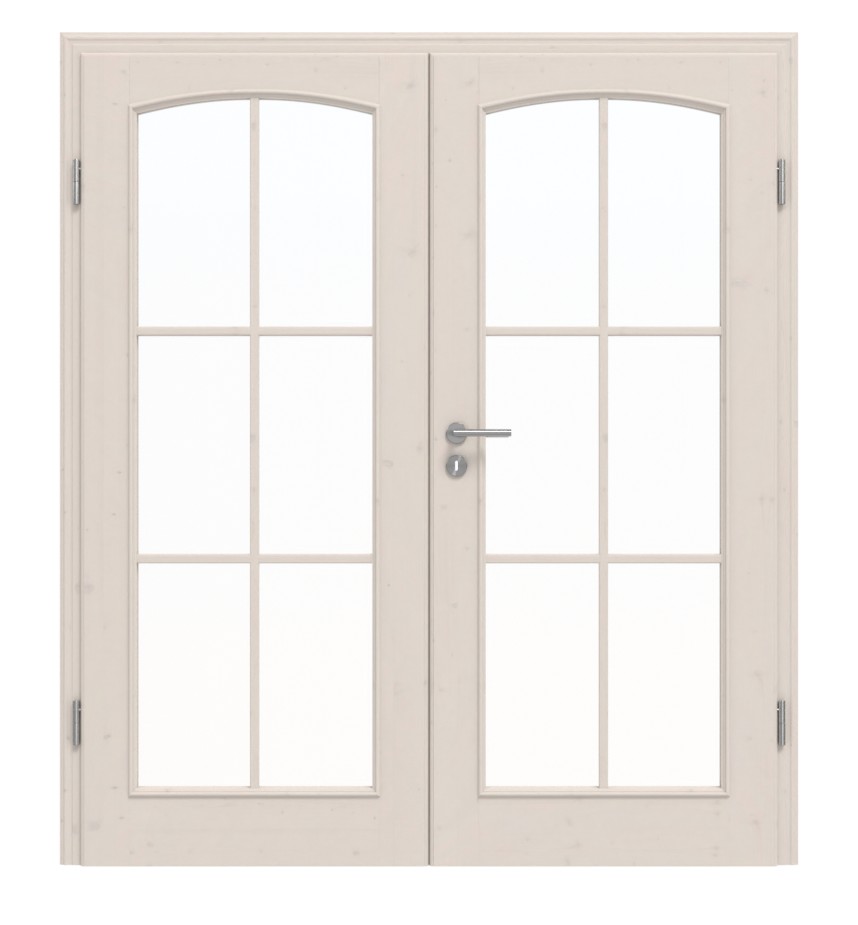 Szerokie fryzy i elegancko zdobione listwy szklane otaczają duże przeszklenia, które zdobią delikatne szprosy. U góry otwory zamykają się stylowym łukiem segmentowym, co skutecznie podkreśla klasyczny charakter. Delikatnie przez sękatą strukturę sosny przebija białe zabarwienie.