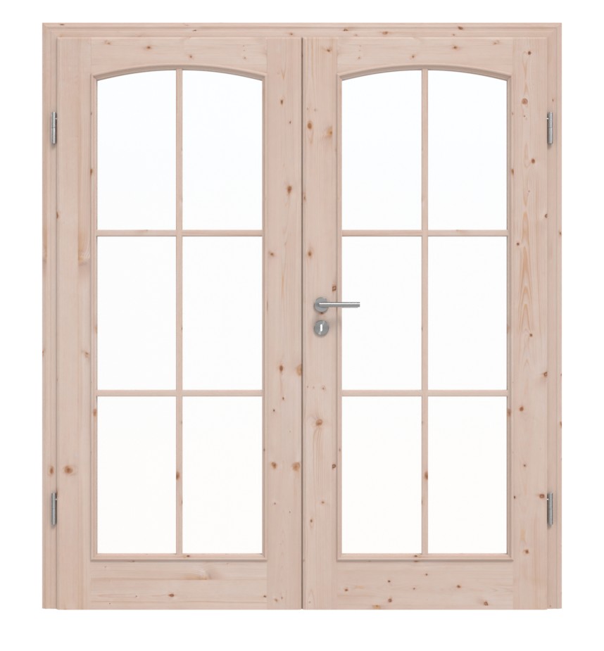 Dzięki dużym otworom świetlnym z eleganckimi łukami segmentowymi i ramami z przegrodami do wnętrza wpada przyjazne światło. Ozdobne listwy szklane i szerokie fryzy dopełniają klasyczny design. Każde drzwi są przesiąknięte indywidualnym układem słojów z wyraźnymi wlotami sęków, co nadaje drewno sosnowe rustykalny charakter.