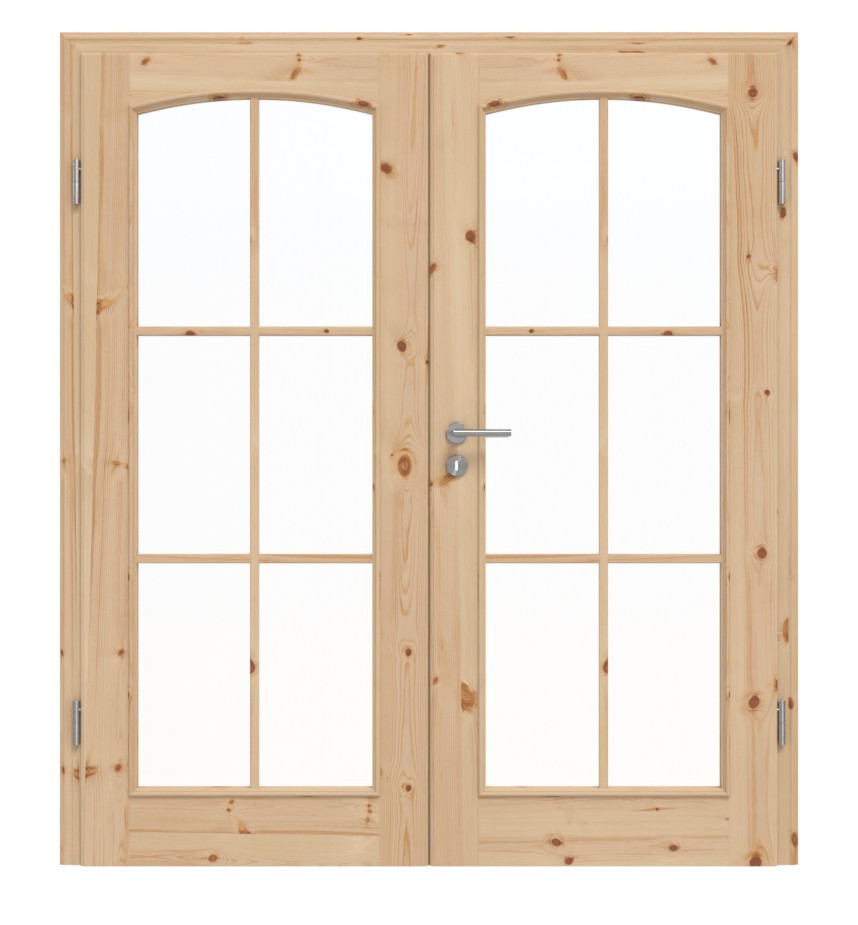 Szerokie fryzy i elegancko zdobione listwy szklane otaczają duże przeszklenia, które zdobią delikatne szprosy. U góry otwory zamykają się stylowym segmentowym łukiem, co doskonale podkreśla klasyczny charakter. Każde drzwi są przesiąknięte indywidualnymi słojami z wyraźnymi ramkami sękowymi, które nadają drewno sosnowe rustykalny charakter.