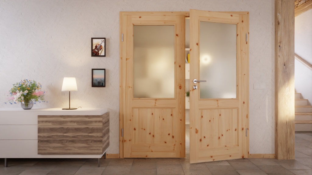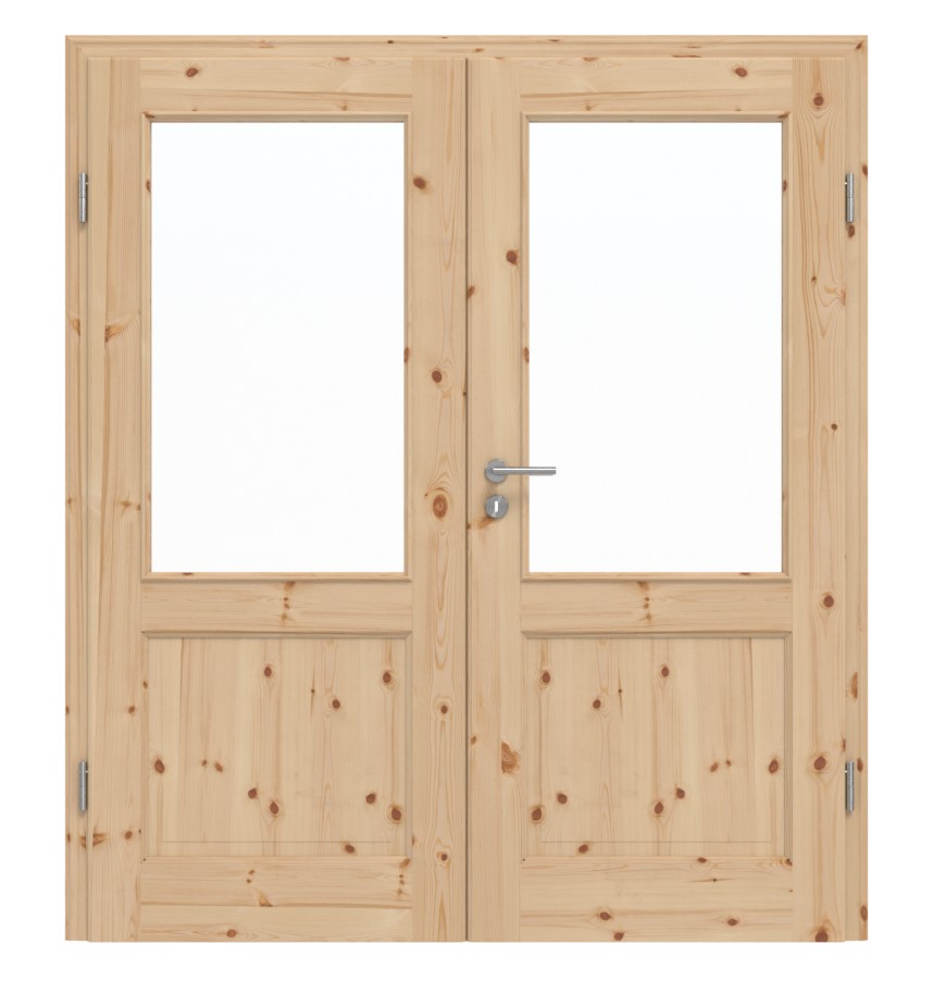 Klasyczny wygląd drzwi uzyskuje się dzięki wyodrębnionym wypełnieniom w dolnej części, które są harmonijnie otoczone eleganckimi profilami fryzowymi. Ponadto dwa szkła pozwalają na przyjemne wpuszczenie światła. Wyraziste słoje z udziałem sęków zdobią drewno sosnowe i nadają mu rustykalny wygląd.