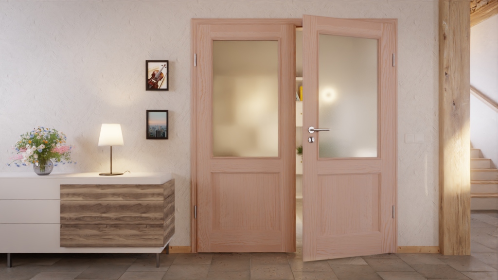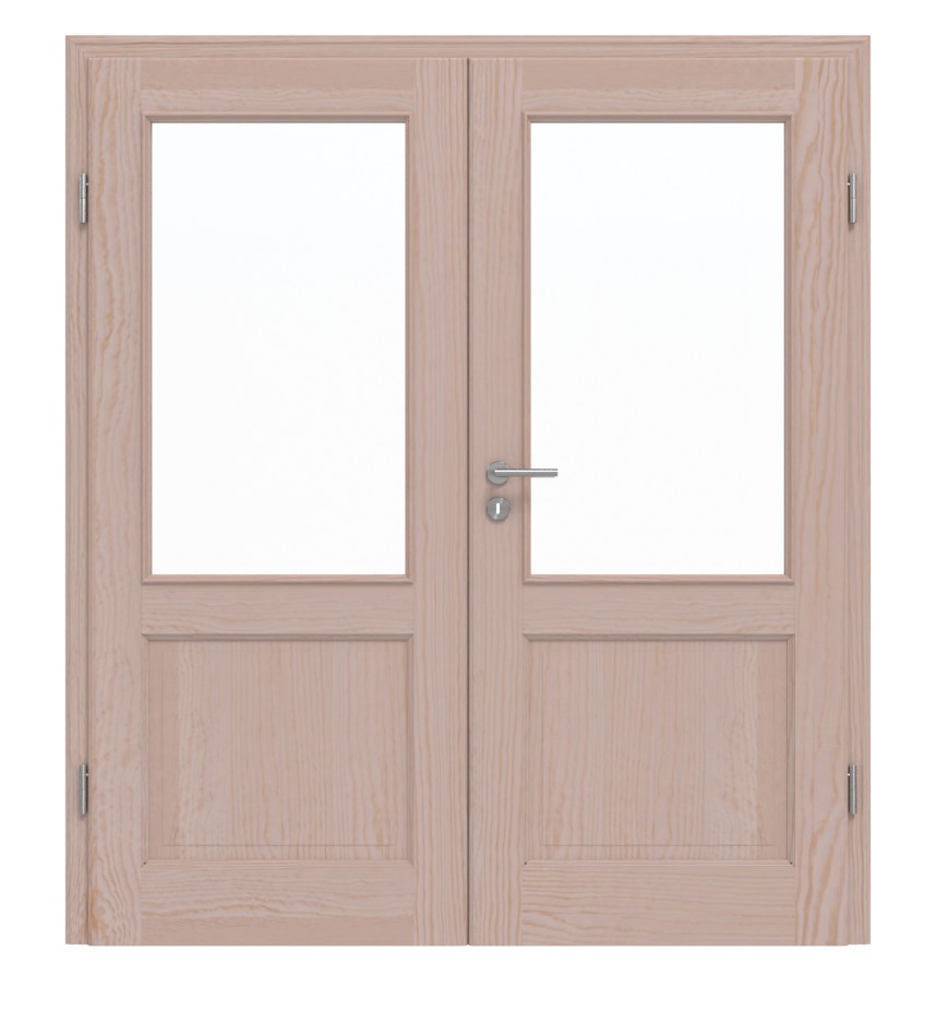 Klasyczny wygląd drzwi uzyskuje się dzięki odseparowanym wypełnieniom w dolnej części, które są harmonijnie otoczone eleganckimi profilami fryzowymi. Dwa szkła powyżej pozwalają na przyjemne wpuszczenie światła. Z natury bezsękowe usłojenie sosny tworzy na każdej drzwiach indywidualny obraz.