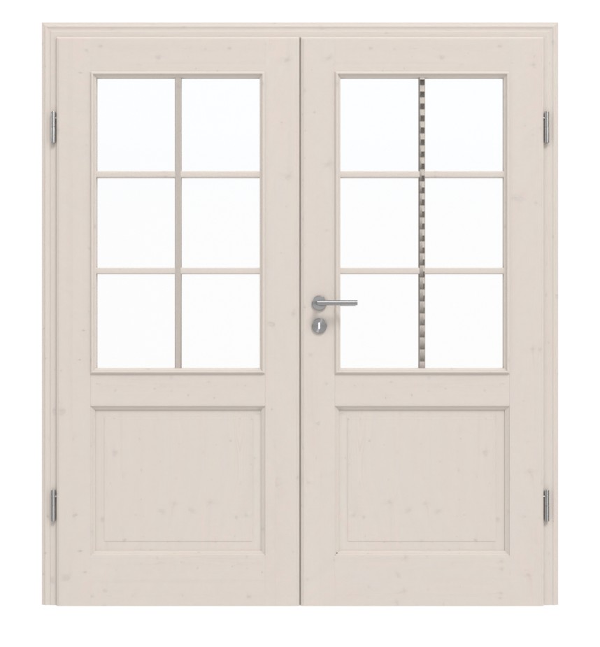 Klasyczna piękność modelu szczególnie wyróżnia się dzięki profilowanym wypełnieniom oraz szklanym wstawkom ozdobionym szprosami. Ponadczasowy wygląd podkreślają stylowe listwy szklane oraz piękne detale profili fryzowych. Delikatnie przez białą pigmentację przebija słojowanie sosny z gałęziami.