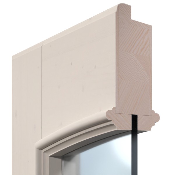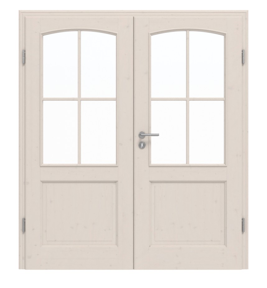 Eleganckie szprosy i listwy szklane nadają oknom z łukiem segmentowym klasyczny charakter. W dolnej części skrzydeł drzwi znajdują się odseparowane wypełnienia z prawdziwego drewna, które są podkreślone stylowymi profilami fryzowymi. Naturalne słoje świerku delikatnie rysują się pod białą pigmentowaną powierzchnią.