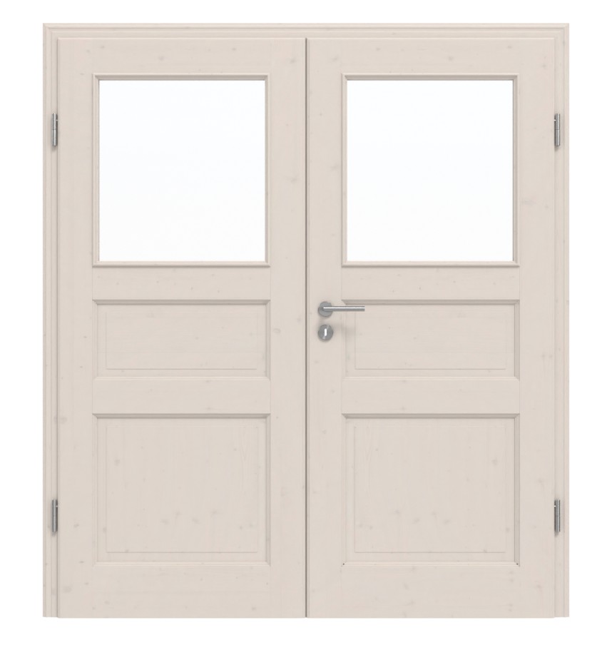 Klasyczna piękność modelu szczególnie wyróżnia się dzięki profilowanym wypełnieniom i prostokątnym przeszkleniom. Ponadczasowy wygląd podkreślają eleganckie listwy szklane i piękne profile fryzowe. Przez białą pigmentację delikatnie przebija się sękowana struktura świerku.
