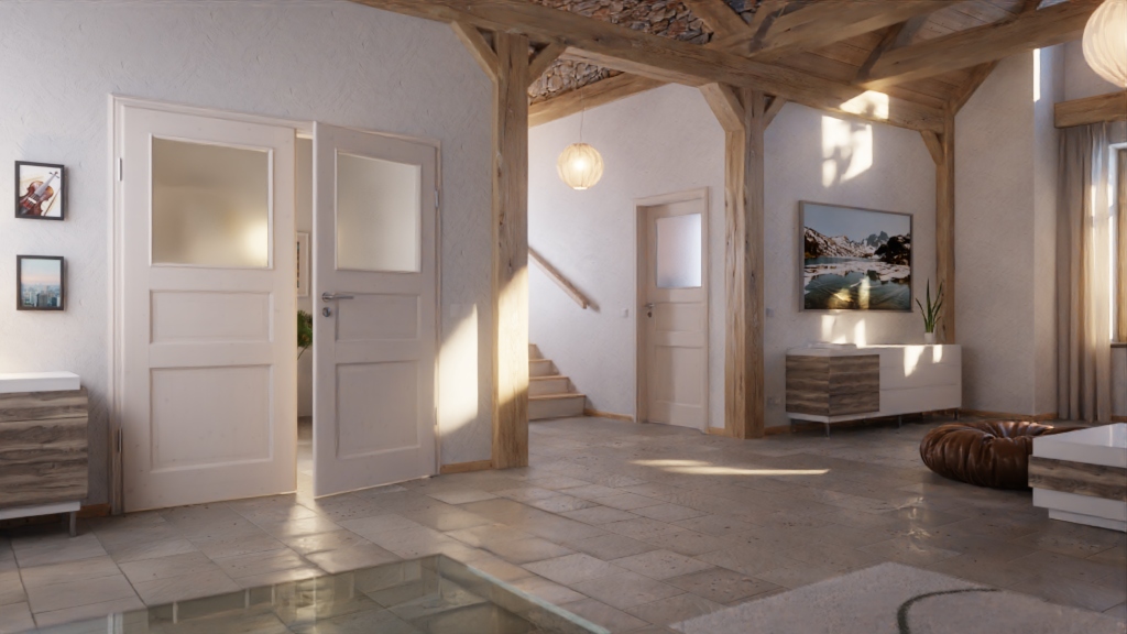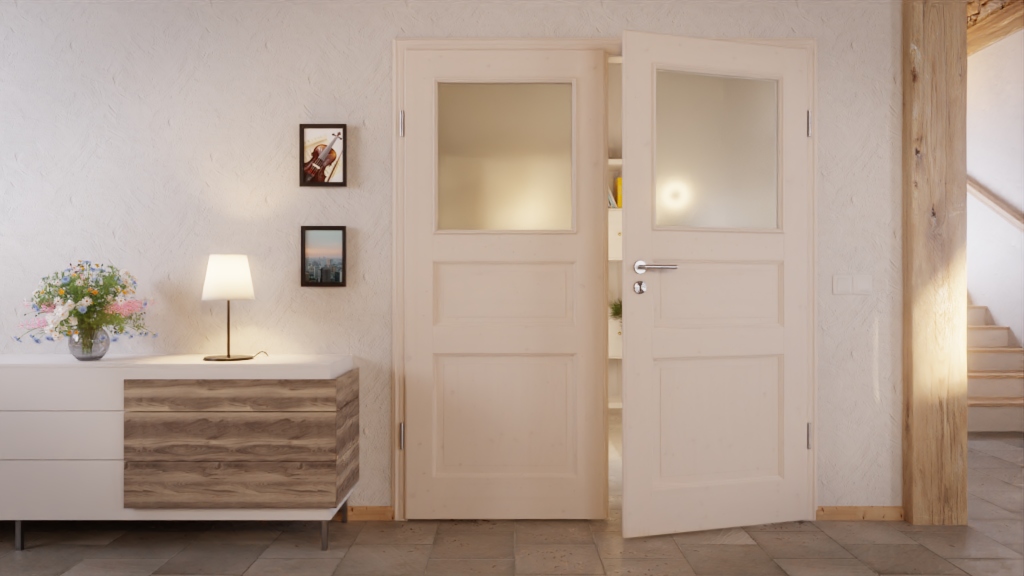 Styl wie wiejski spotyka tradycyjne rzemiosło: Podwójne skrzydło drzwi z litego drewna TE-38 w świerku z sękami jest wytwarzane przez doświadczonych stolarzy z dużą dbałością o szczegóły.