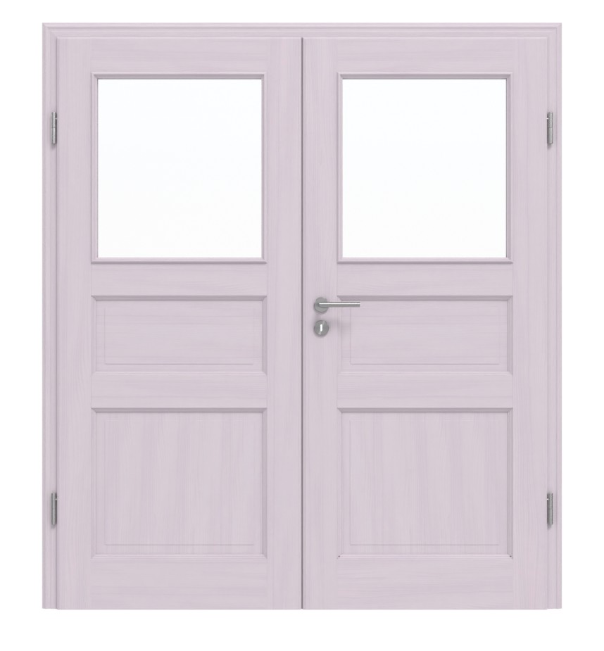 Klasycznie piękny model wyróżnia się szczególnie dzięki profilowanym wypełnieniom i prostokątnym przeszkleniom. Ponadczasowy wygląd podkreślają eleganckie listwy szklane i piękne profile fryzowe. Dzięki białej pigmentacji delikatnie uwidaczniają się bezsękowe usłojenia sosny.