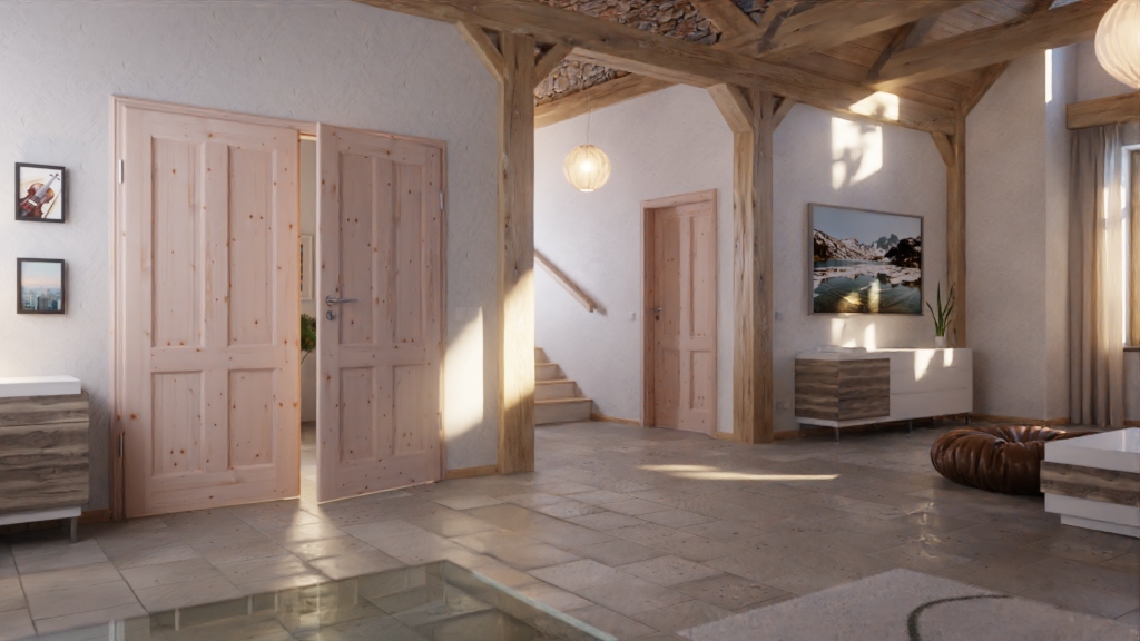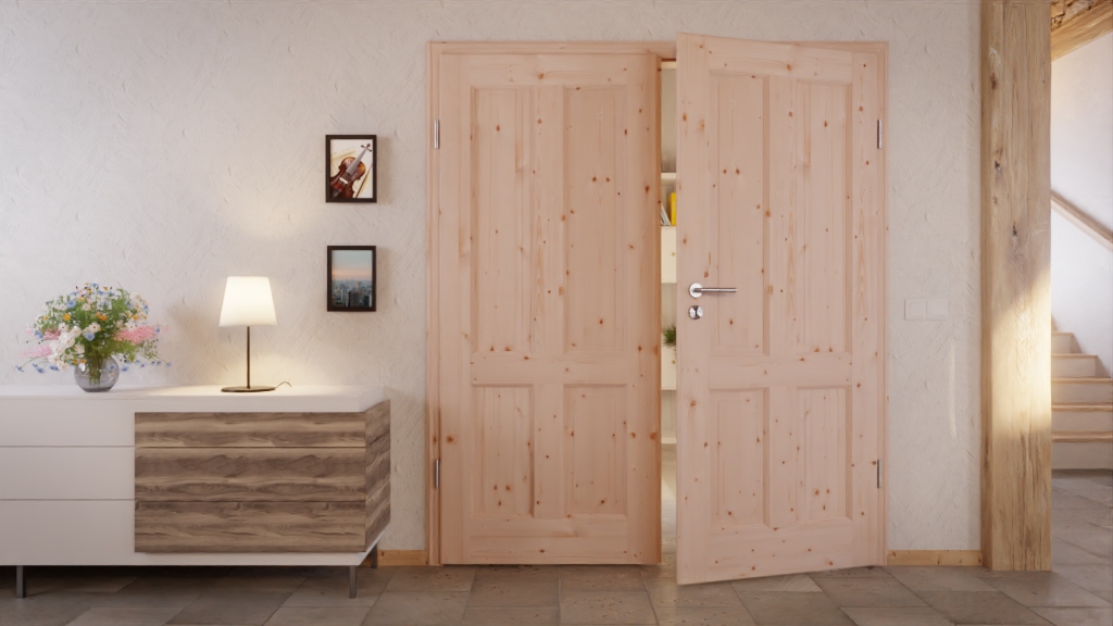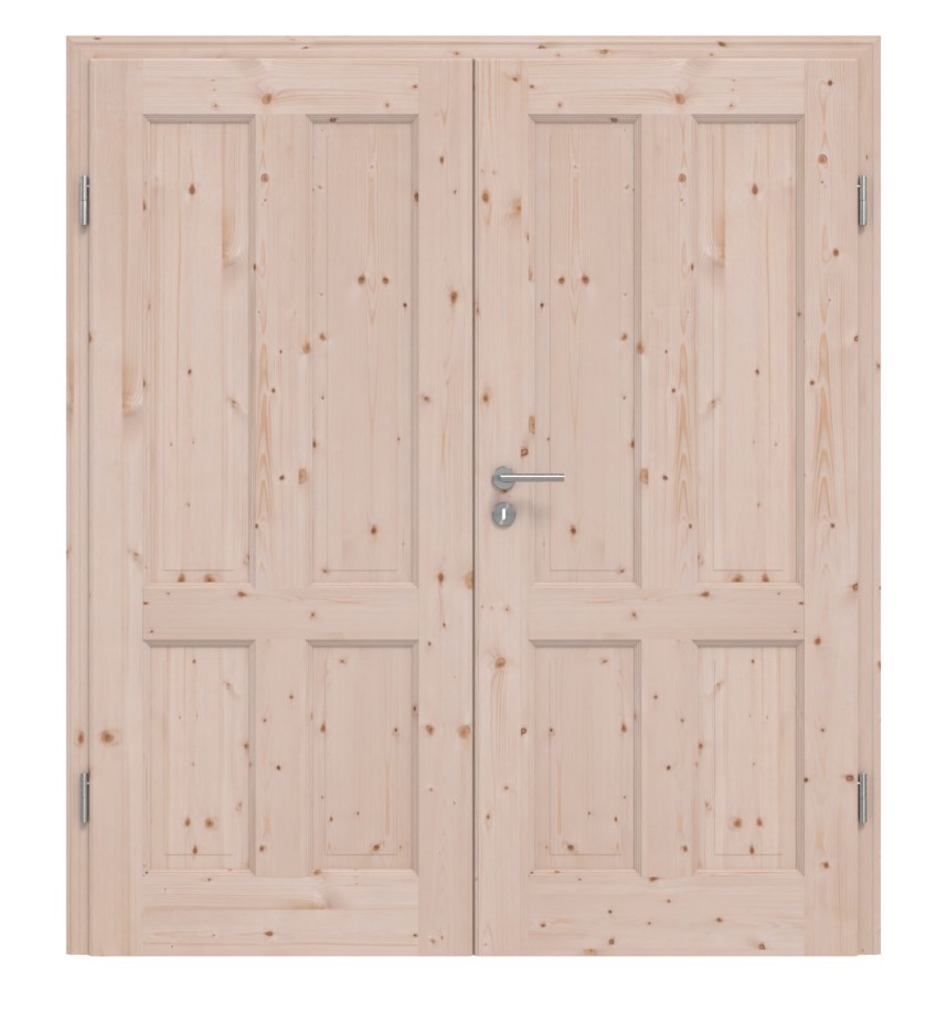 Starannie wykonane podwójne drzwi wewnętrzne z naturalnego drewna w komplecie z ościeżnicą: