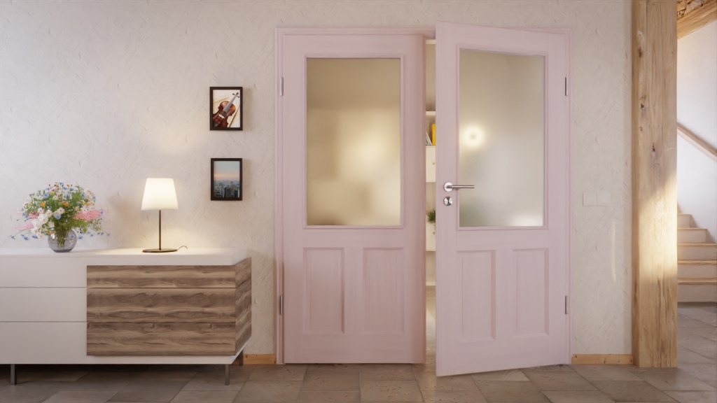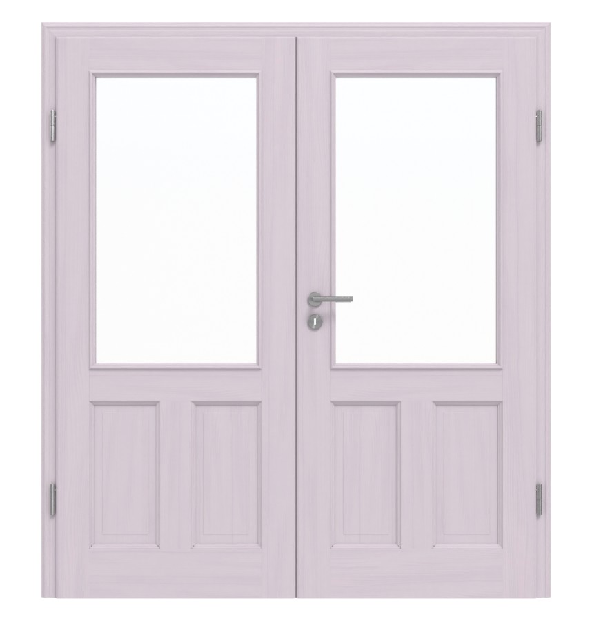 Osadzone między szerokimi fryzami, dwa profilowane wypełnienia z prawdziwego drewna oraz okno świetlne otoczone listwami szklanymi tworzą klasyczny wygląd skrzydeł drzwiowych. Dzięki powierzchni pigmentowanej na biało delikatnie przebija usłojenie sosny bezsękowej.