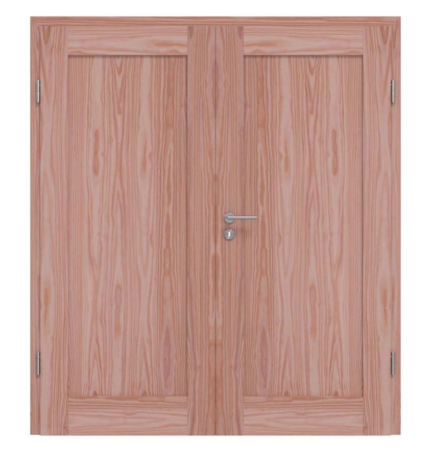 Ze swoimi szerokimi fryzami i dużymi wypełnieniami drzwi skrzydłowe mówią jasnym językiem form. Na drewno modrzewiowe rysują się naturalne słoje.