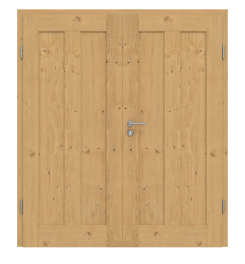 Zainspirowana stylem Bauhaus: Nowoczesne drzwi podwójne z litego drewna TE-10 z dębu z sękami łączą precyzyjną jakość wykonania z zrównoważonym designem.