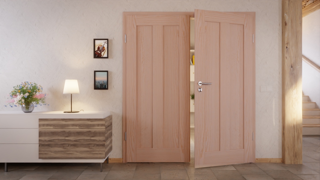 Prostota, która inspiruje: Podwójne skrzydło drzwi z litego drewna TE-10 z sosny bezsękowej jest starannie wykonane przez doświadczonych rzemieślników.