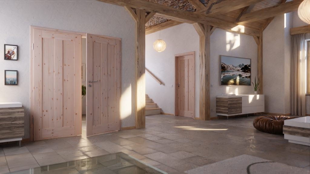 Drzwi z litego drewna zachwycają doskonałą stabilnością, którą osiągają dzięki konstrukcji klejonej warstwowo. Aby uzyskać odpowiednie wykończenie, możesz wybrać opcję w menu konfiguracyjnym. Alternatywnie, standardowo nieobrobiona powierzchnia oferuje elastyczne możliwości samodzielnego wykończenia drzwi.