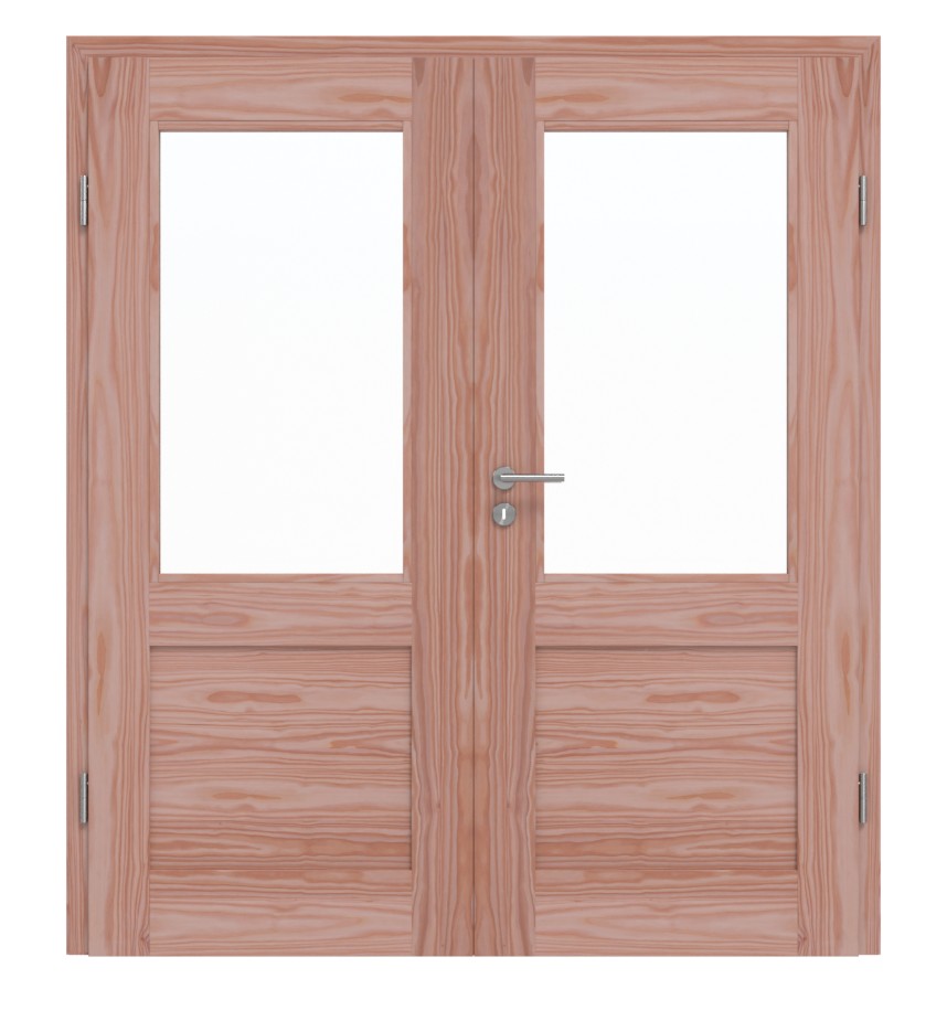 Atrakcyjny produkt rzemieślniczy w stylu Bauhaus: Nowoczesne podwójne drzwi z litego drewna TE-16 z modrzewia łączą wiejski urok z miejskim szykiem.