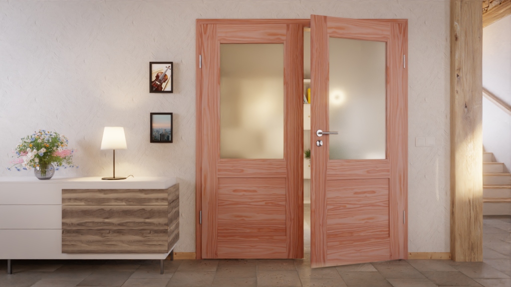 Każde z okienek, płaskim wypełnieniem i prostymi listwami szklanymi tworzy na skrzydłach drzwi klarowny design. Charakterystyczne słoje rozciągają się na ciepłym drewno modrzewiowym, wprowadzając przytulną atmosferę do pomieszczenia.