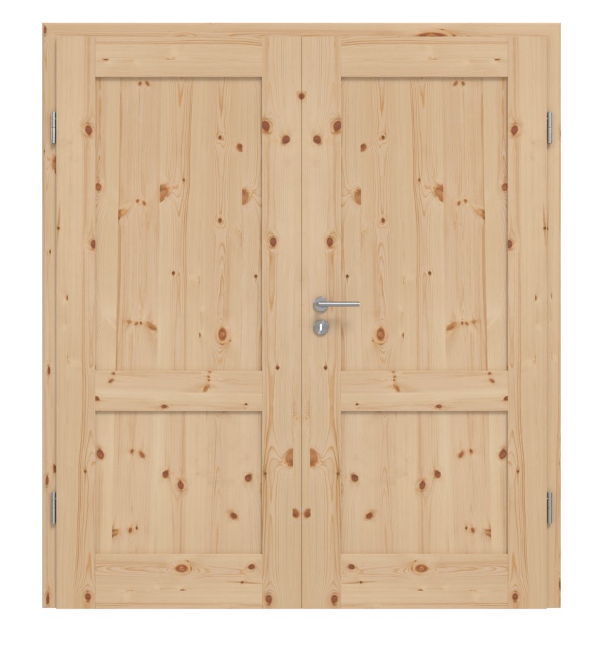 Każde skrzydło drzwi ma po dwa płaskie wypełnienia z prawdziwego drewna, a proste fryzy tworzą nowoczesny design. Każde drzwi są przesiąknięte indywidualnymi usłojeniami z wyraźnymi ramkami, które nadają drewno sosnowe rustykalny charakter.
