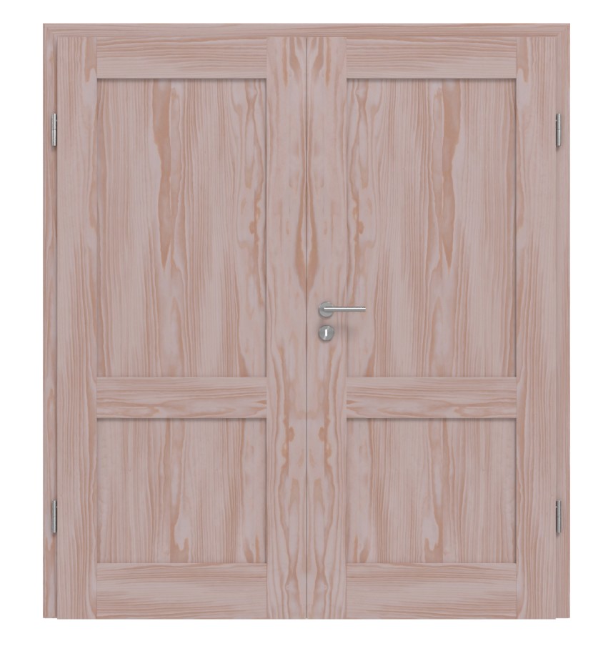 Dwa płaskie wypełnienia z prawdziwego drewna na każde skrzydło drzwi oraz proste fryzy łączą się w nowoczesny design. Naturalna, bezsękowa struktura przechodzi przez drewno sosnowe i tworzy na każdym drzwiach unikalny obraz.