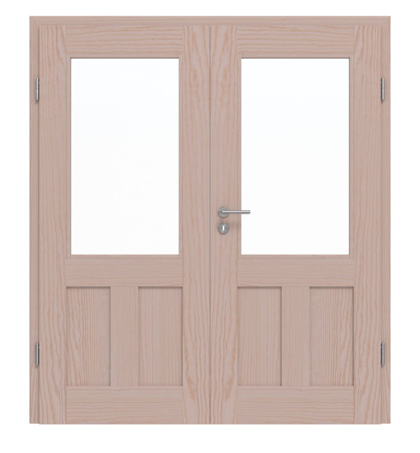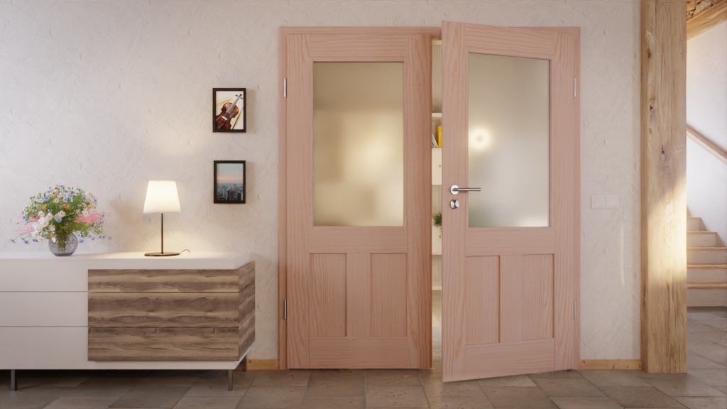 Każde skrzydło drzwi zawiera przeszklenie, dwa mniejsze, płaskie wypełnienia oraz proste listwy szklane, które tworzą nowoczesny design z wyraźnymi liniami. Na drewno sosnowe rysują się bezsękowe usłojenia.