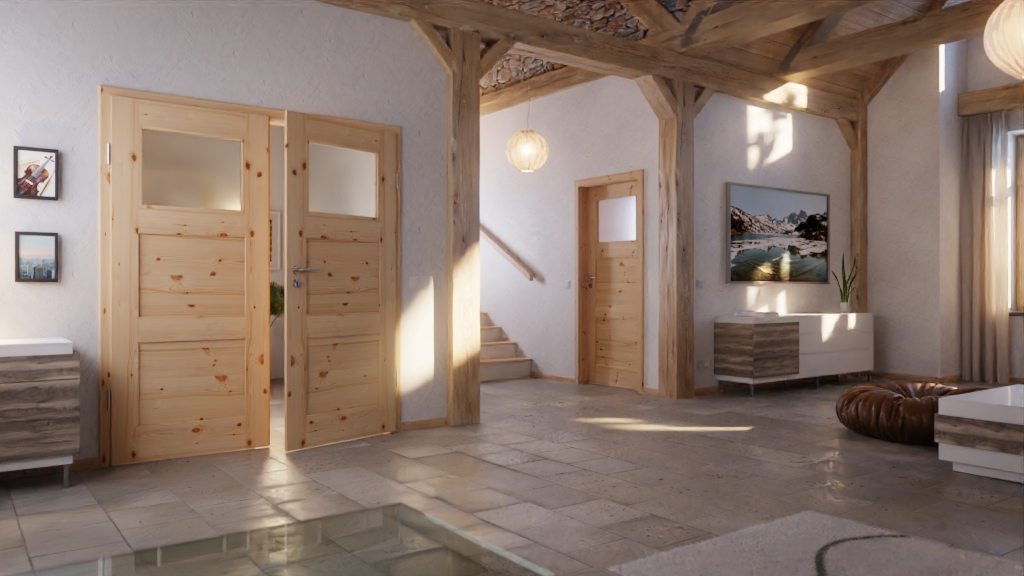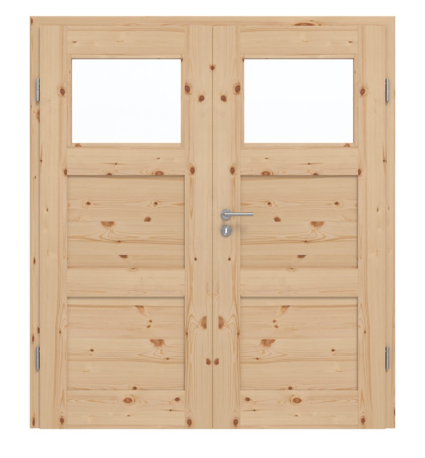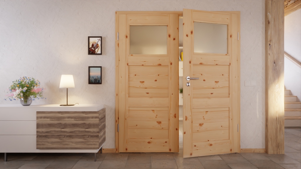 Współczesny design drzwi wewnętrznych składa się z jednego okna świetlnego i dwóch płaskich wypełnień na skrzydło drzwi. Naturalnie uformowane słoje z wtrąceniami nadają rustykalny charakter drewna sosnowego.