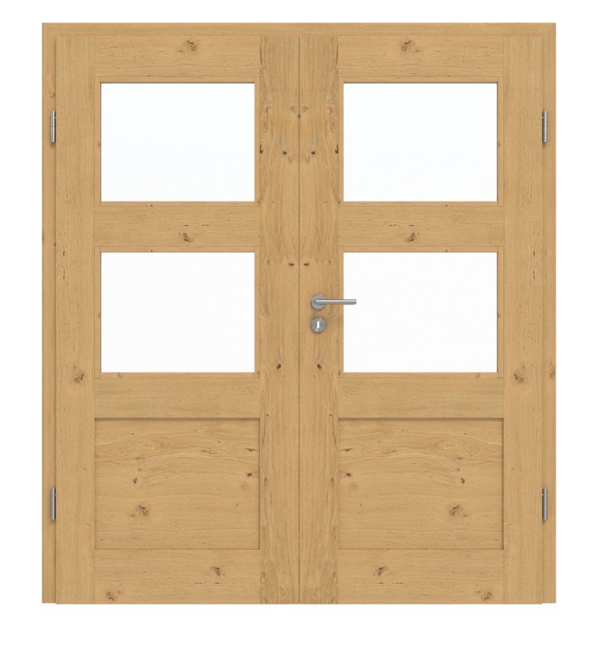 Styl Bauhausu spotyka tradycyjne rzemiosło: nowoczesne podwójne skrzydło drzwi z litego drewna TE-32 z dębu z sękami zachwyca zrównoważonym designem i wysoką jakością.