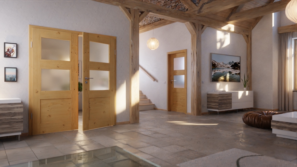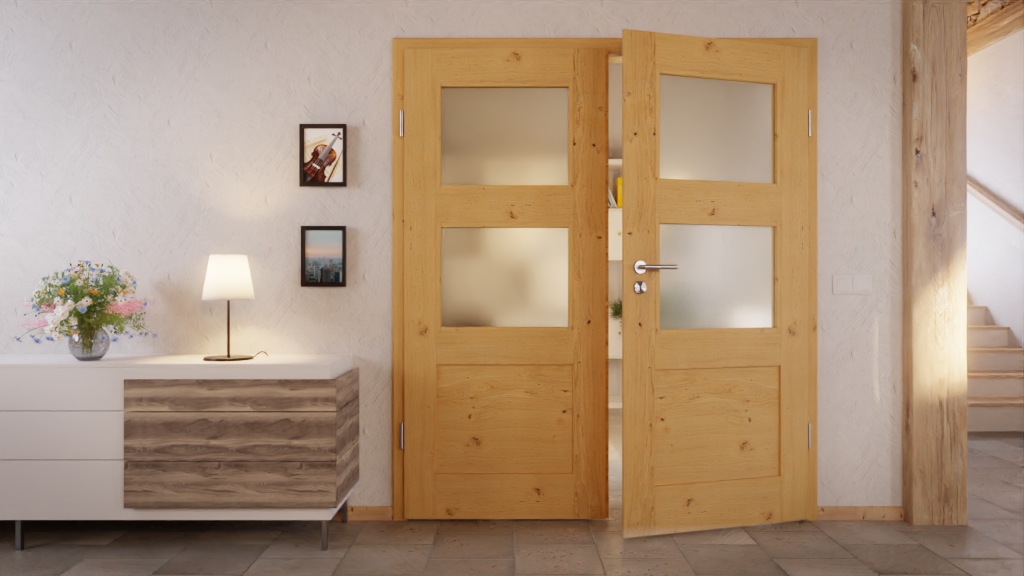 Wyraźne kontury dostarcza drzwi pokojowe z dwoma przeszkleniami i płaskim wypełnieniem z prawdziwego drewna na każde skrzydło. Dzięki usłojeniu z sękami drewno dębowe wprowadza rustykalny klimat do wnętrza.