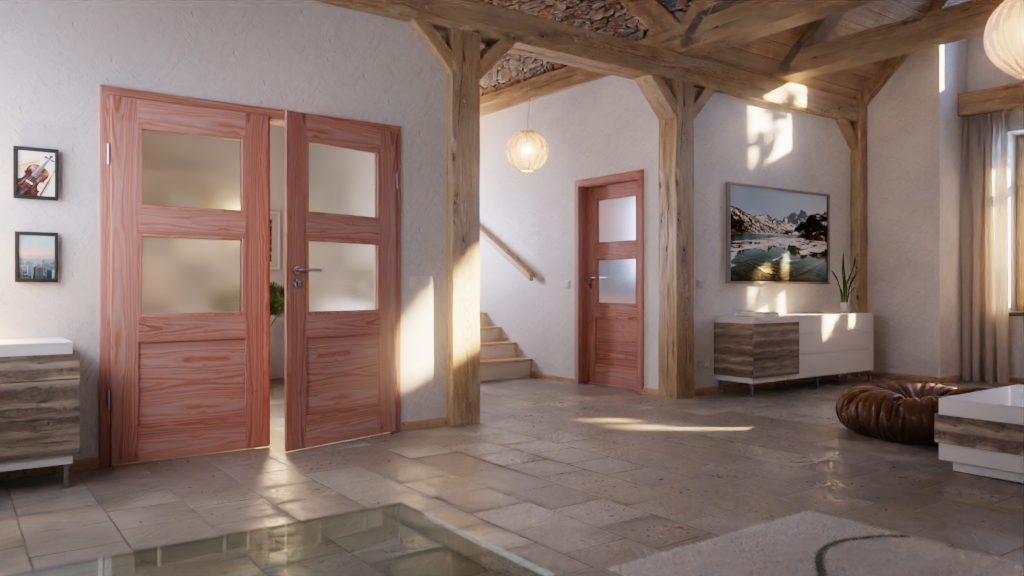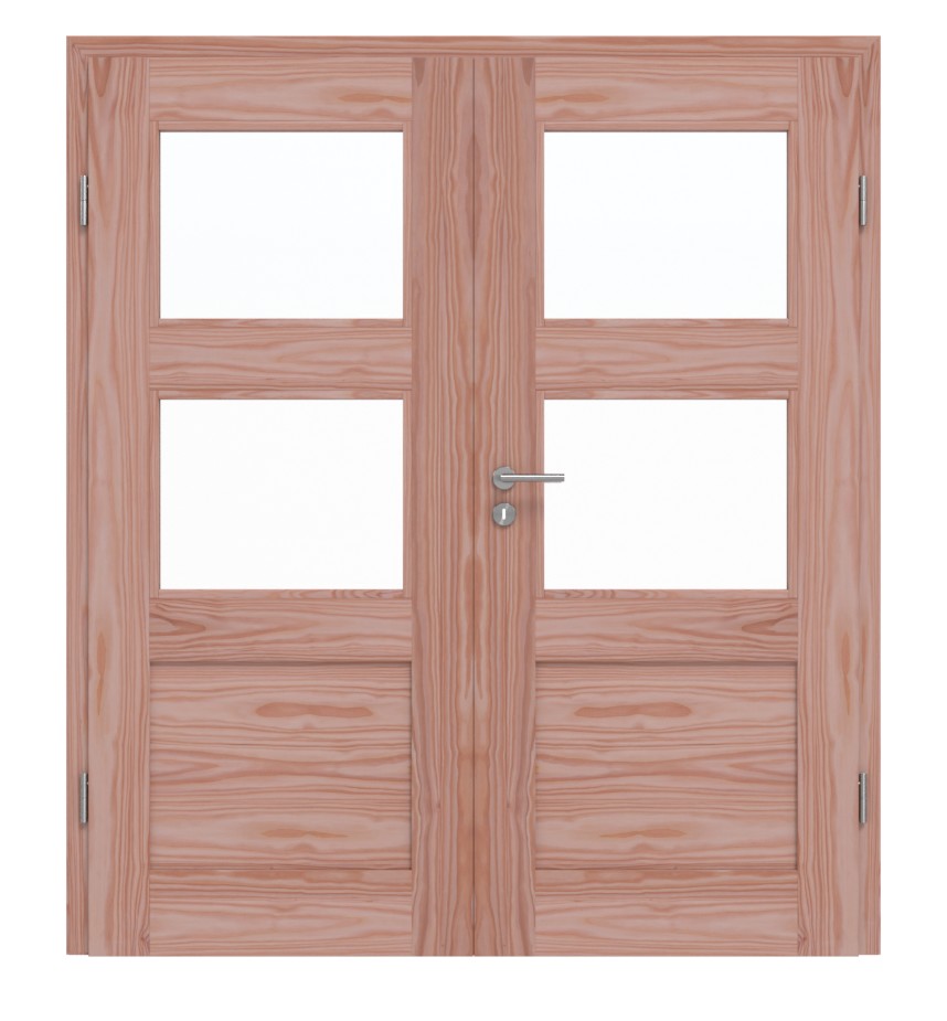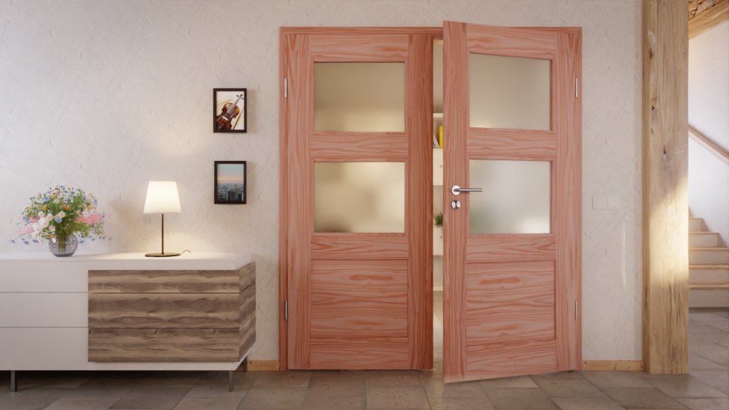 Nowoczesny design z dwoma przeszkleniami i litego drewna w każdym skrzydle drzwi wyróżnia się wyraźnymi liniami. Charakterystyczne słoje rozciągają się na ciepłym drewna modrzewiowego, wprowadzając przytulną atmosferę do pomieszczenia.