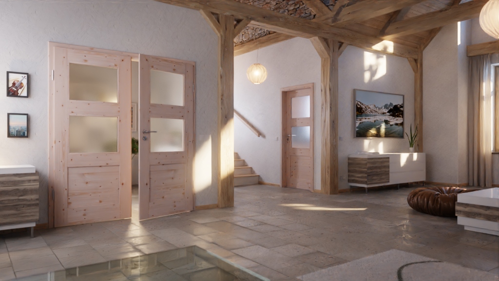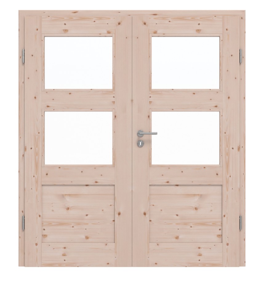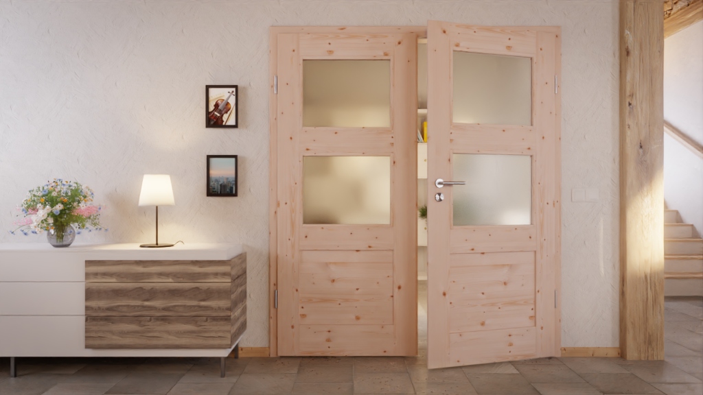 Nowoczesny design z dwoma przeszkleniami i wypełnieniem z prawdziwego drewna na każde skrzydło drzwi zachwyca swoją klarowną linią. Każde drzwi są przesiąknięte indywidualną strukturą z wyraźnymi sękami, co nadaje drewno sosnowe rustykalny charakter.