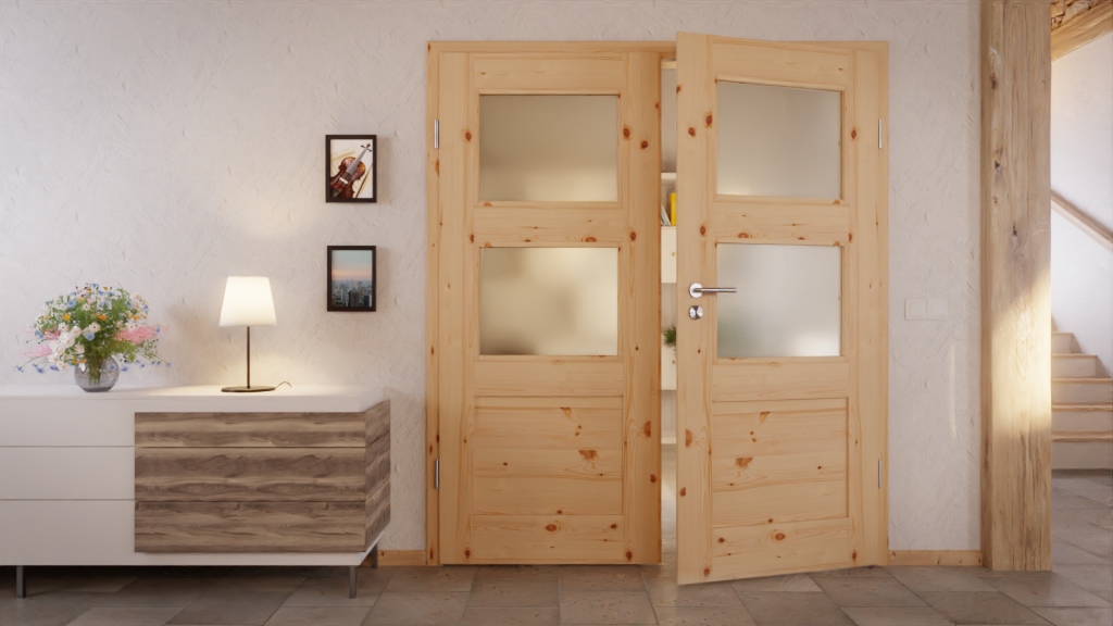 Nowoczesny design drzwi wewnętrznych składa się z czterech przeszklenia i dwóch płaskich wypełnień. Każde drzwi są przesiąknięte indywidualnymi słojami z wyraźnymi ramkami, które nadają drewno sosnowe rustykalny charakter.
