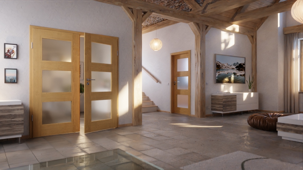 Wyraźne kontury charakteryzują okna świetlne, które układają się jeden nad drugim na obu skrzydłach drzwi. Rysunki drewna, stworzone przez naturę, zdobią dąb, który w swojej ciepłej estetyce tworzy przytulną atmosferę.