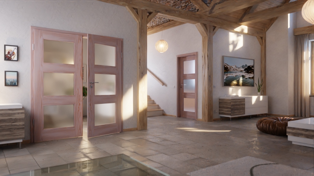 W grę wchodzi światło, ponieważ sześć przeszkleń wprowadza przyjazną jasność do pomieszczenia. Naturalne, bezsękowe usłojenie przechodzi przez drewno sosnowe i ukazuje na każdej drzwiach unikalny wzór.
