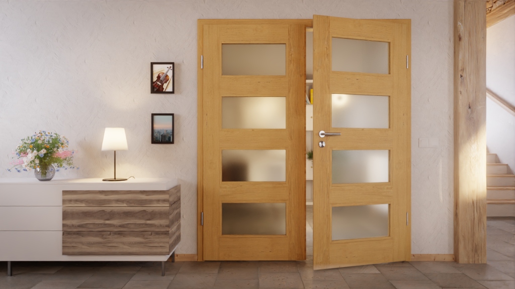 Równo ułożone, szkła wpuszczają do pomieszczenia dużo światła. Charakterystyczne słoje przechodzą przez ciepłe dębowe drewno, nadając każdym drzwiom indywidualny charakter.