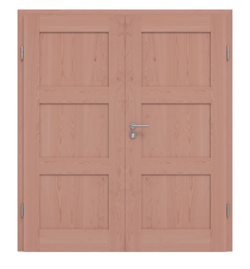 Każde skrzydło drzwi ma trzy płaskie wypełnienia, co nadaje modelowi wyraźną strukturę. Naturalna indywidualność drewna bukowego objawia się w każdej drzwiach w niepowtarzalnym usłojeniu.
