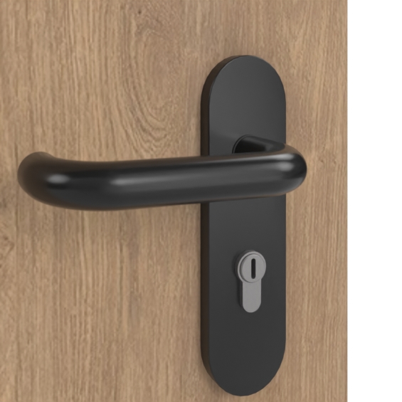 Skrzydło drzwiowe, 2 zawiasy obiektowe, zamek PZ, górny mechanizm zamykający, zestaw klamkowy